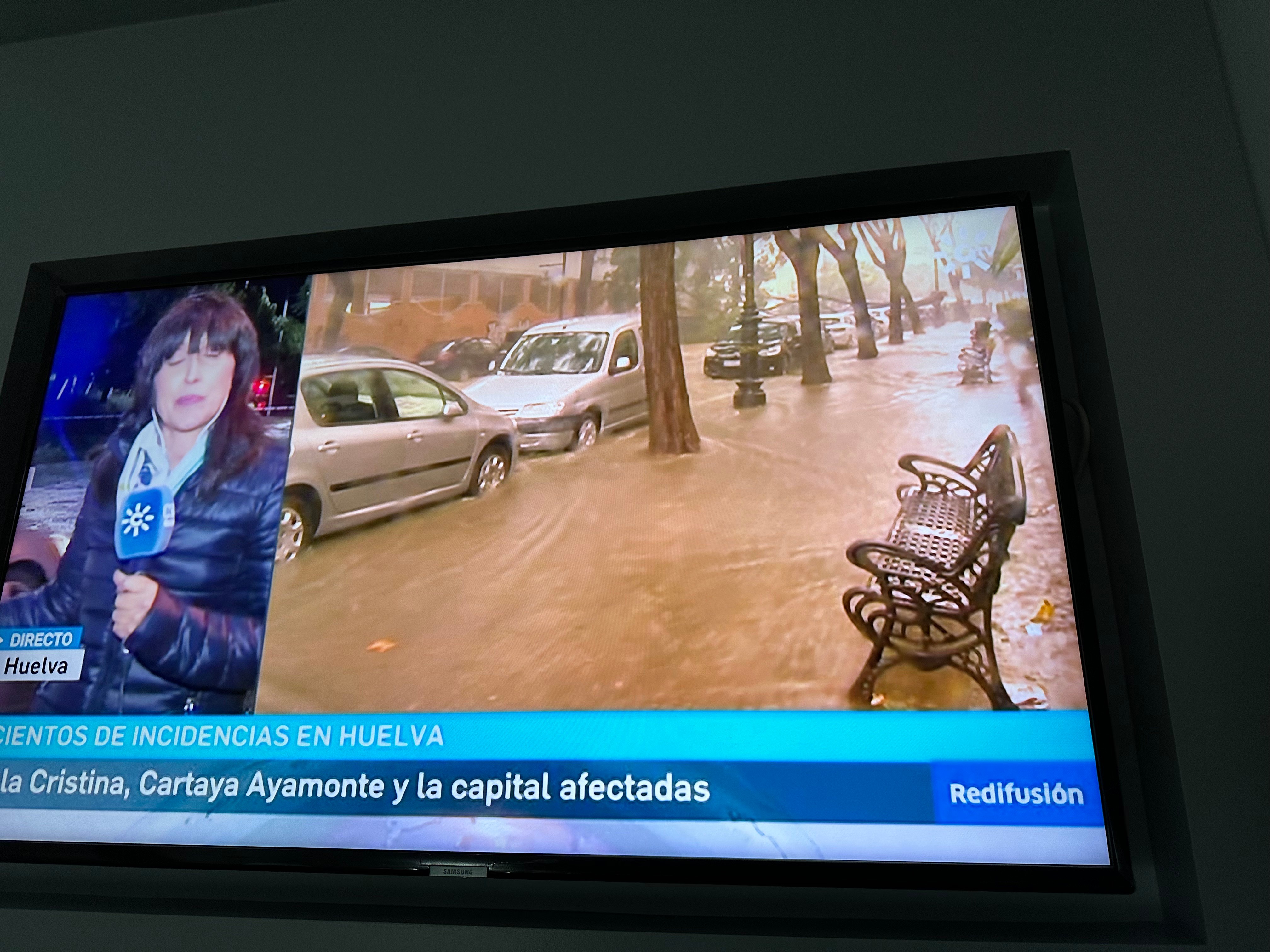 Адпачываючы вечарам у апартаментах, глядзелі мясцовае тэлебачаньне. Быў прамы этэр з горада Ўэльва, што знаходзіцца ля мяжы з Партугаліяй - акурат той кірунак, дзе мы першапачаткова плянавалі ехаць, будучы ў Севільі.