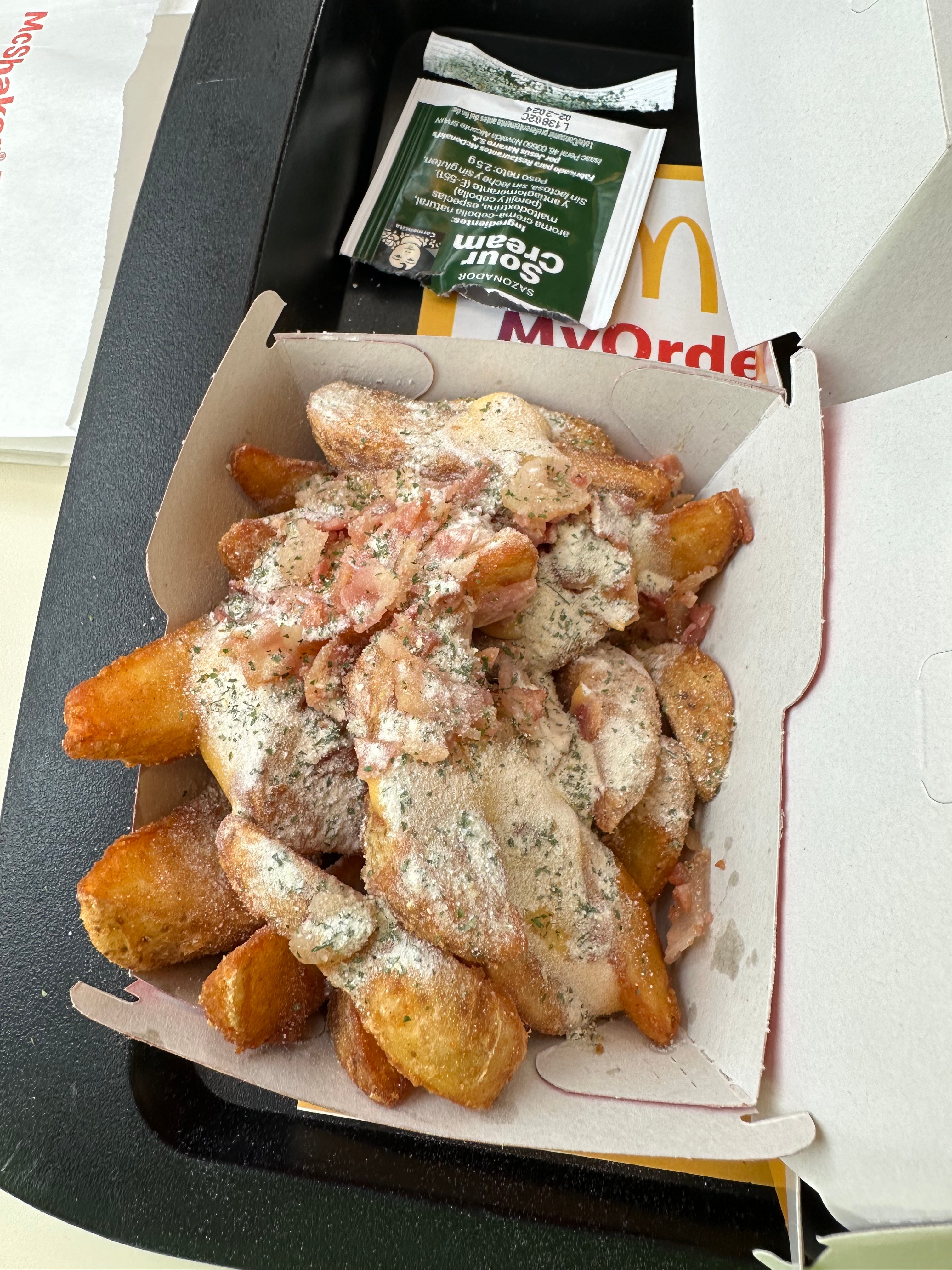 Упершыню пакаштаваў у марбэльскам Макдональдзе бульбу фры з беконам ды пасыпкай са смакам смятаны ды цыбулі - гэта проста хіт. Хімія, але вельмі смачная :D
