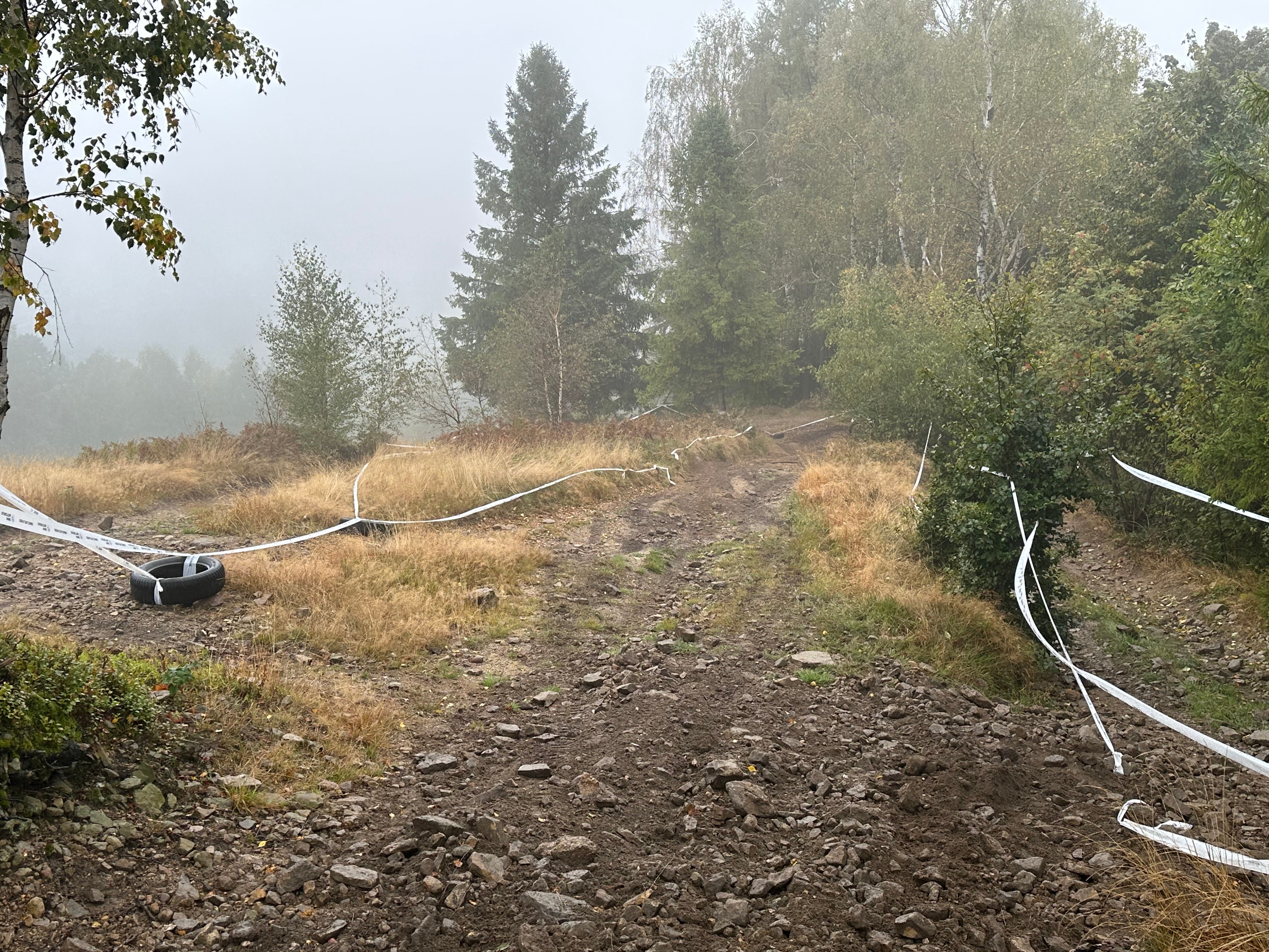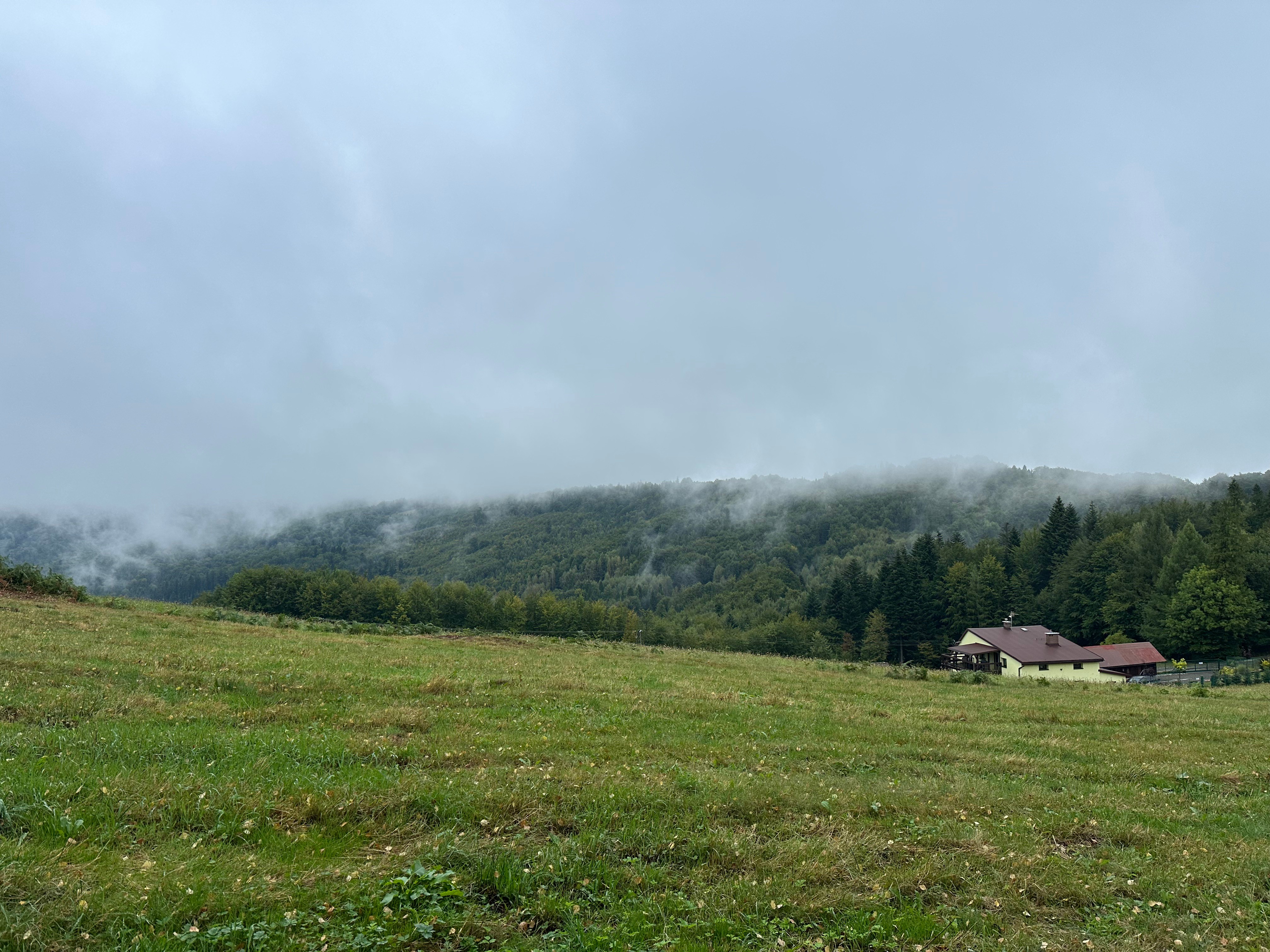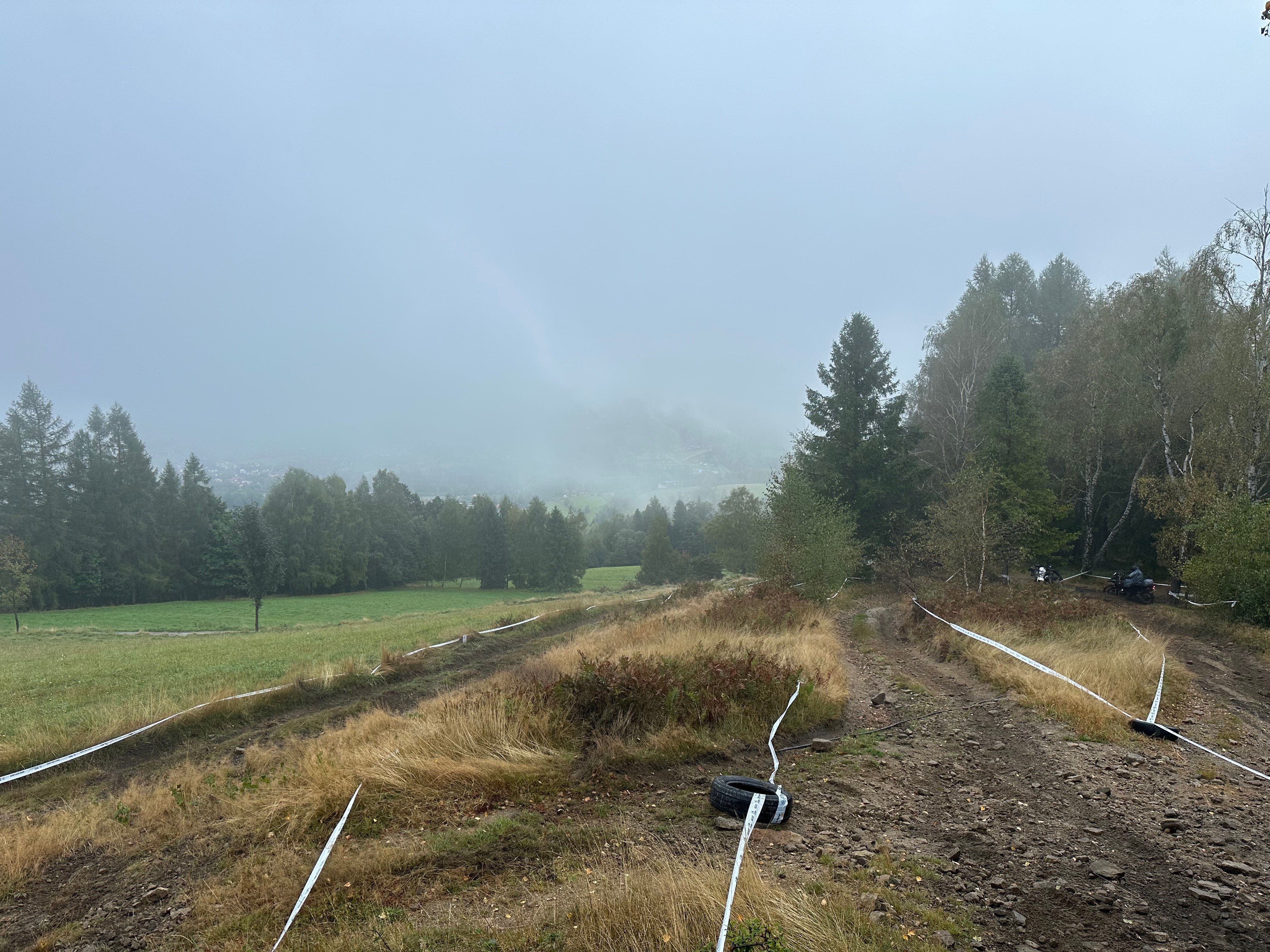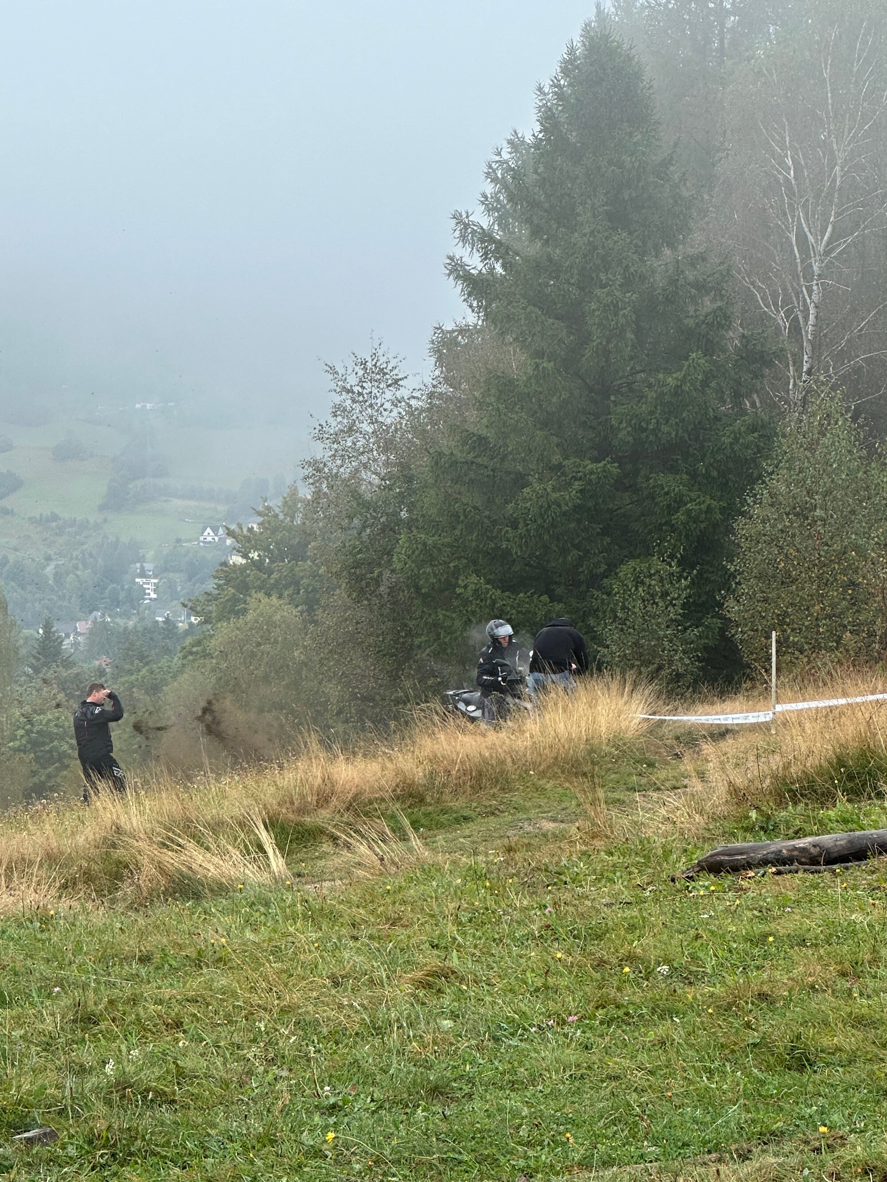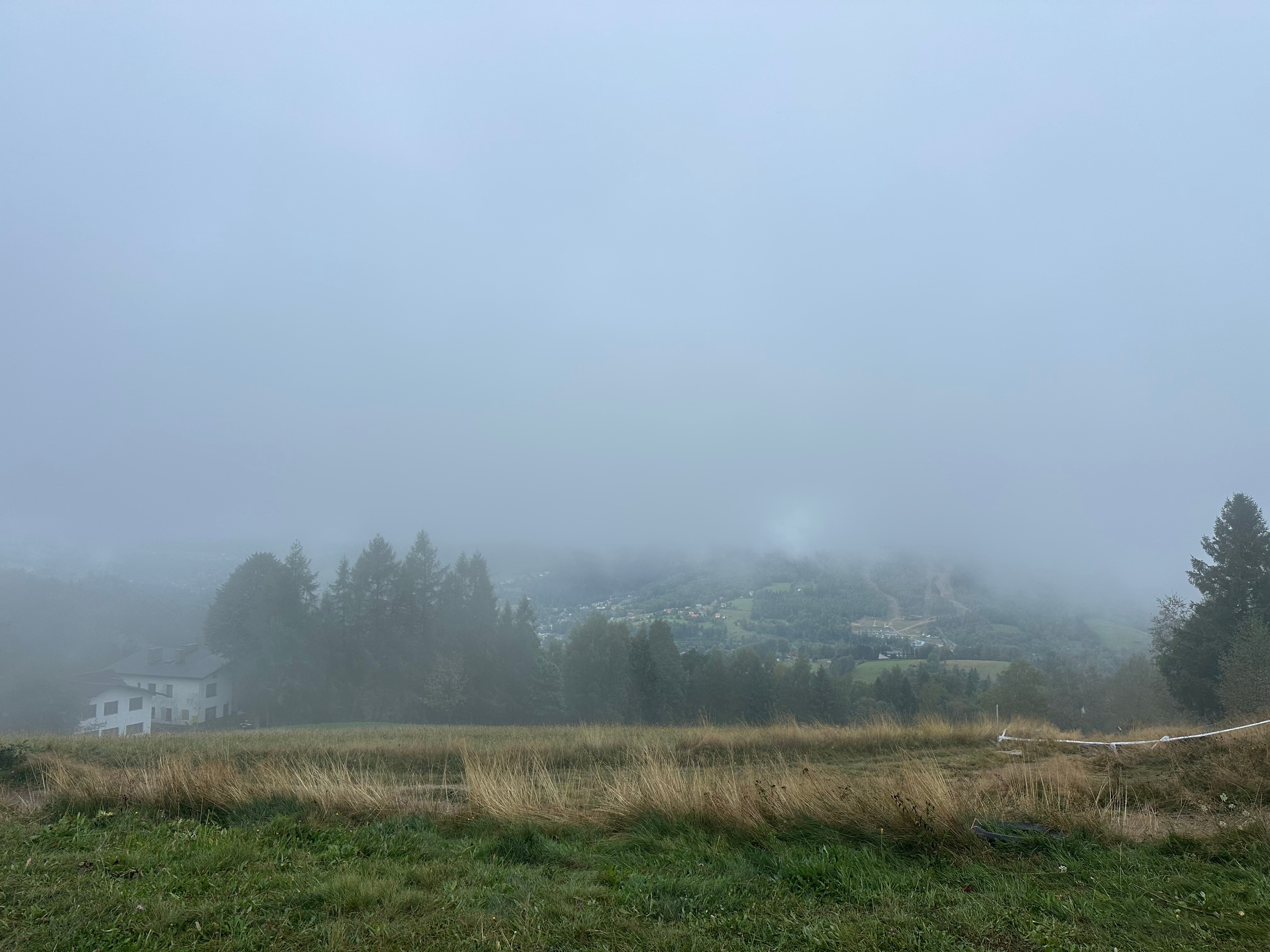 Мы зачэкініліся і стартавалі. Ліў дождж. Траса шла асфальтам у кірунку цэнтра Віслы, потым павяртала ў бок гатэляў на гару. Туман канешне дадаваў атмасфернасьці.