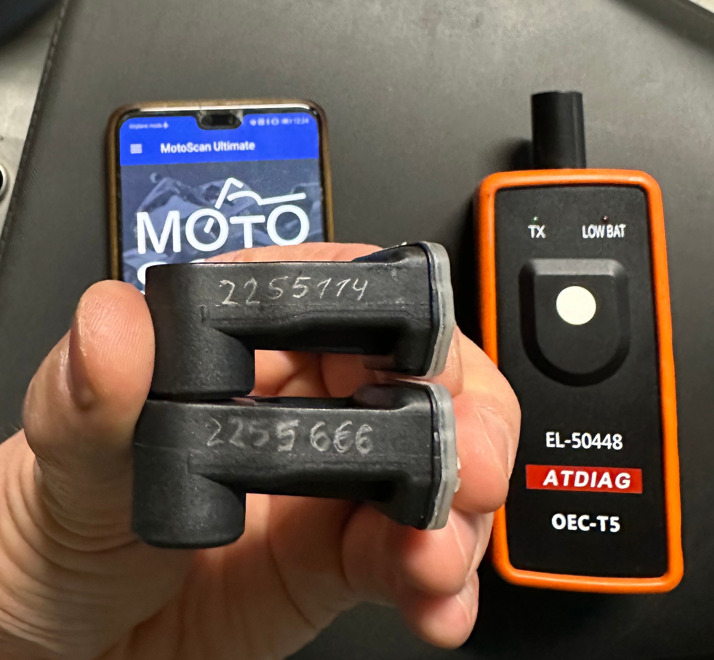 Каб абудзіць чуйнікі і прывязаць іх да матацыкла спатрэбіцца спецыяльная прылада TPMS EL-50448. Таксама купіў у кітайскіх сяброў за 20zł(5€), таксама клон арыгінальнай прылады.